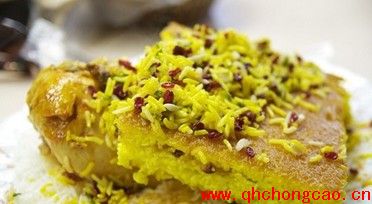 做法:首先,把淘洗干净的500克泰国香米放锅中,加入500克淡奶油和适量白糖,掺清水上火煮至水快干时,淋入适量冷水,转小火煮至米饭熟。随后,把米饭舀入不锈钢盛器内,浇少许用藏红花泡成的水,放进提子干,和匀压实,用锡纸封好,放进温度调至170℃的烤箱里,烘烤约20分钟,取出,揭去锡纸,分别盛入小碟内,即可上桌。